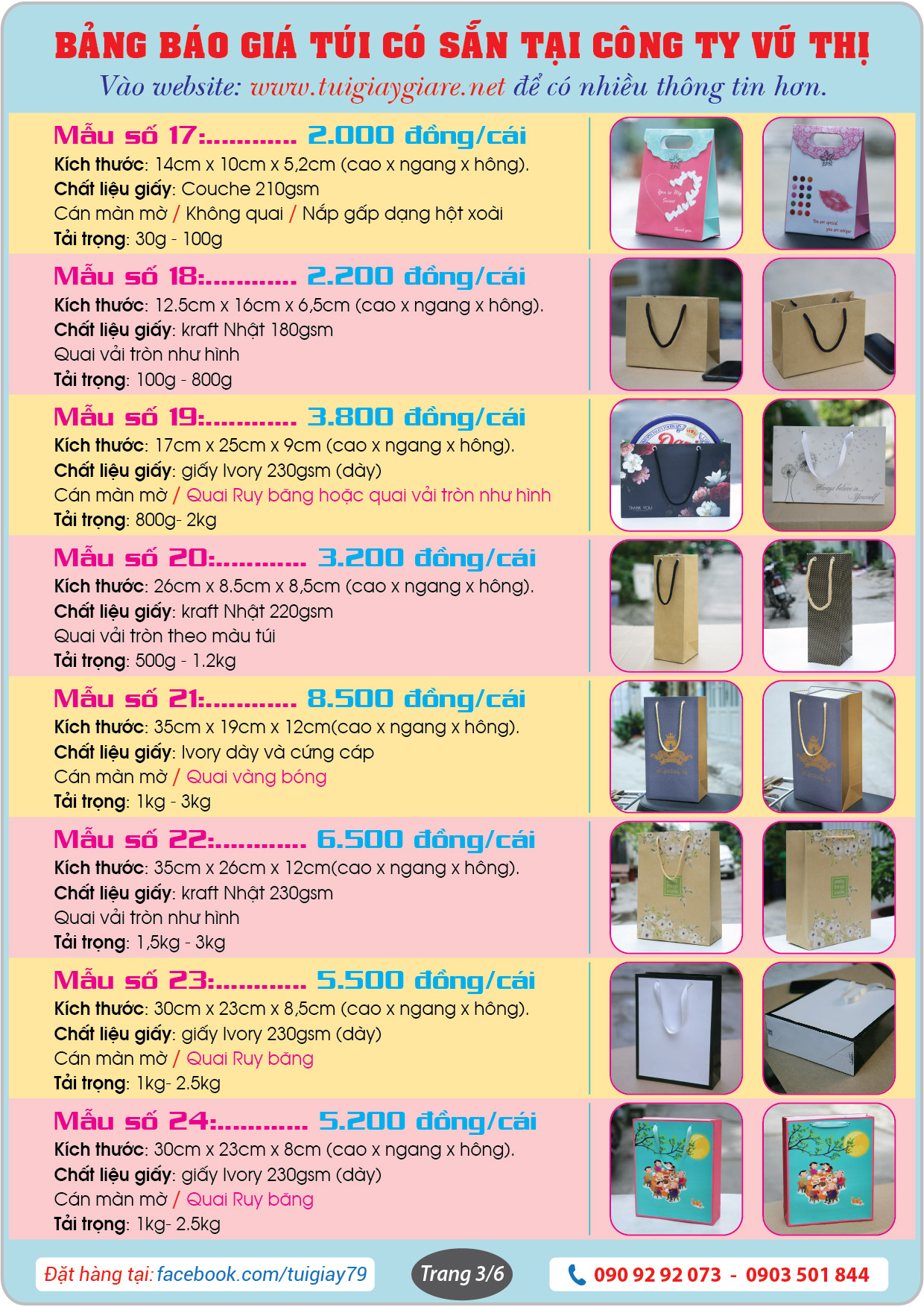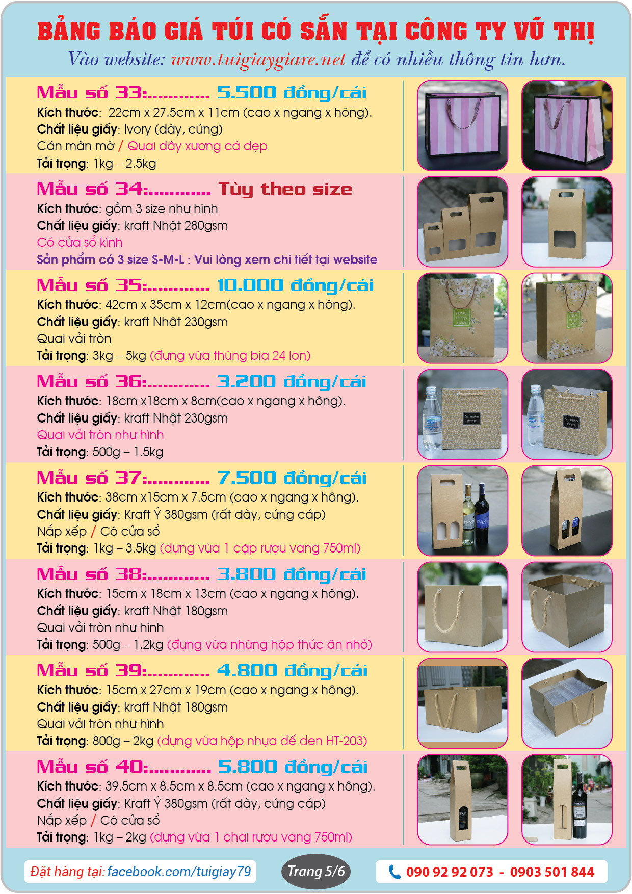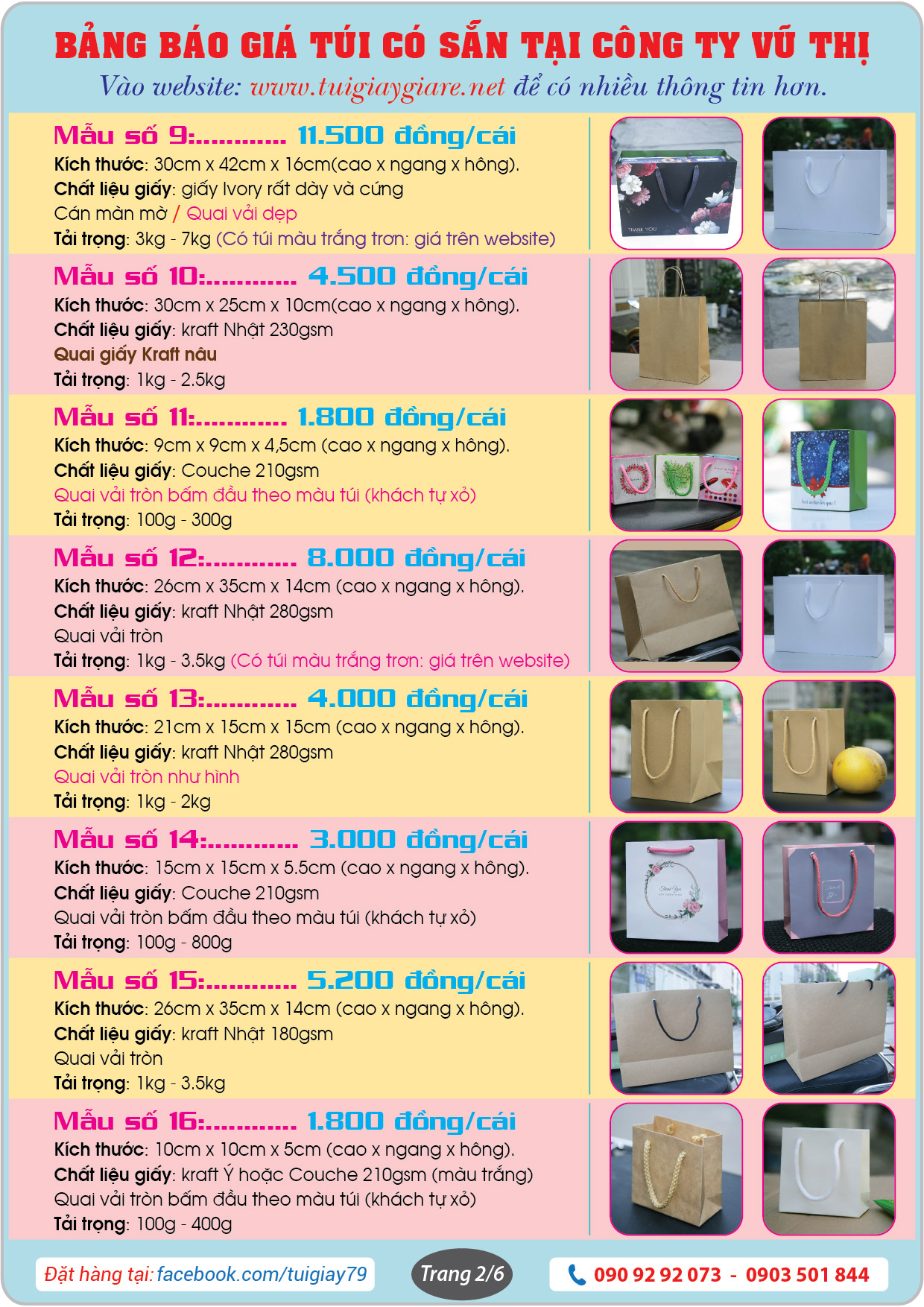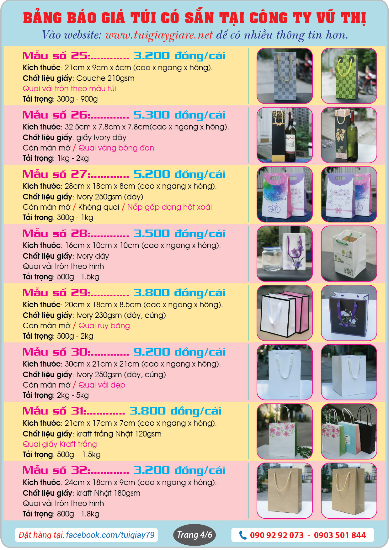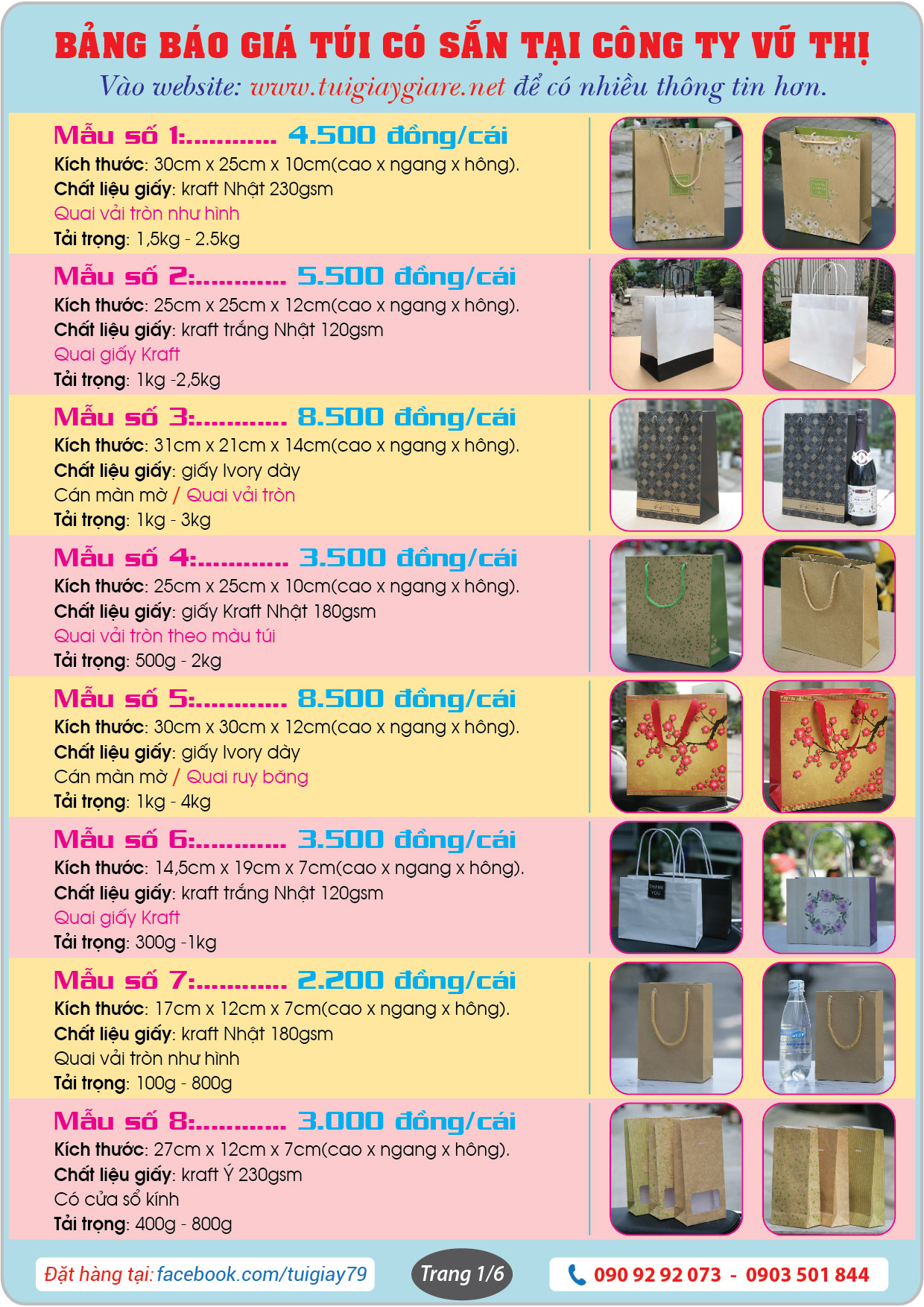 Đây là bảng báo giá và những mẫu Túi giấy có sẵn tại website www.tuigiaygiare.net.