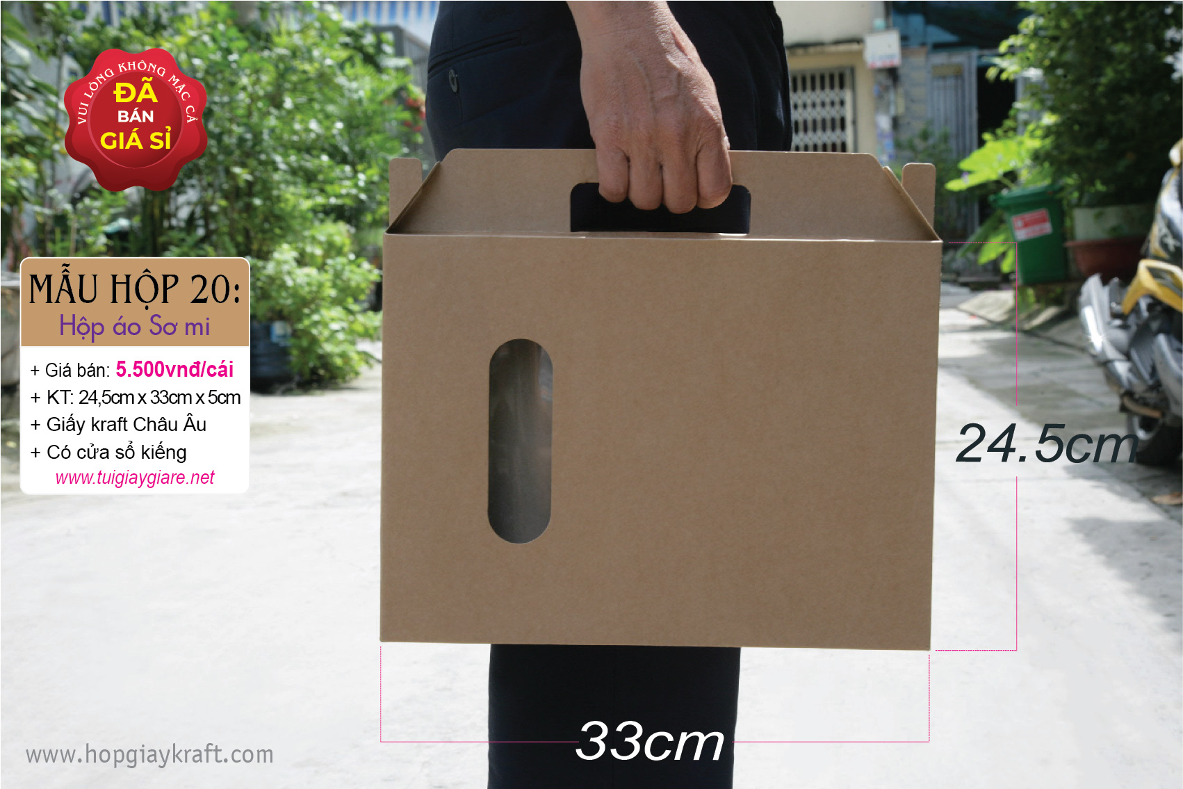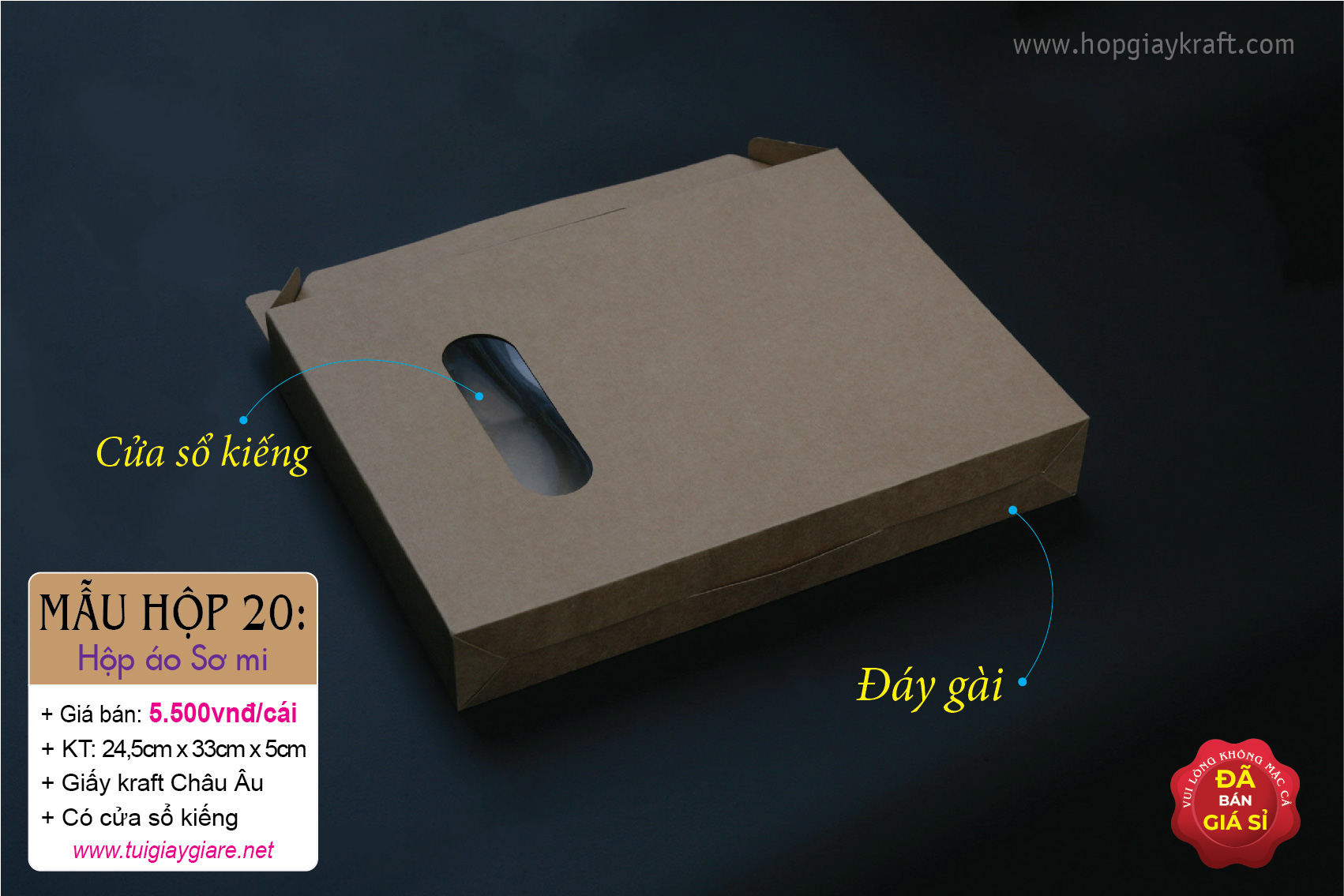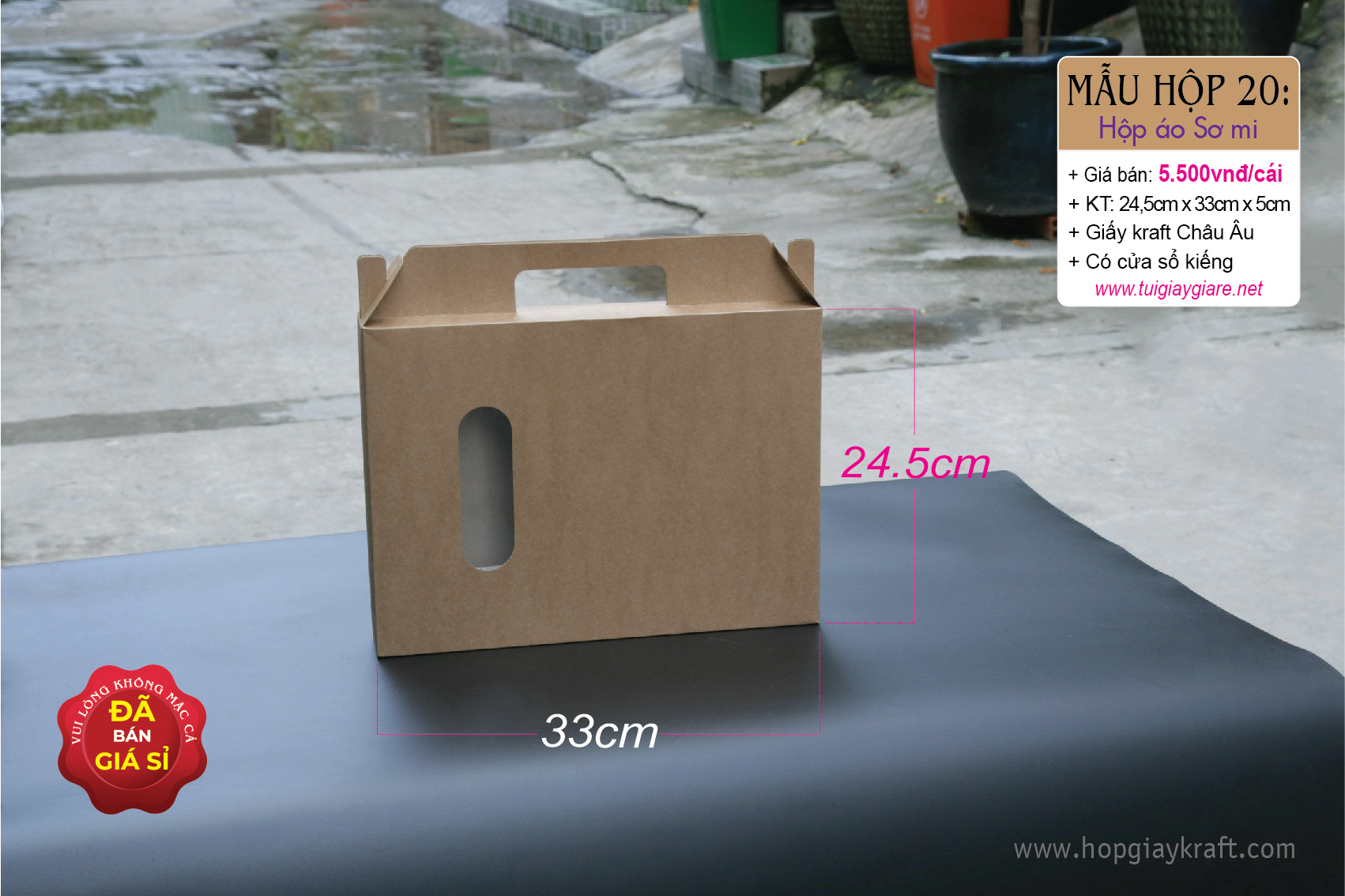 + Chất liệu: giấy Kraft Châu Âu 320gsm (Giấy kraft Châu Âu se có màu sậm hơn giấy Kraft Nhật)