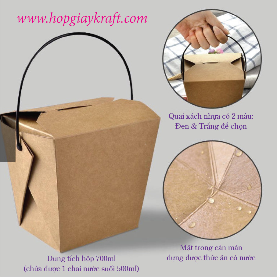 + Hộp giấy kraft phù hợp đựng thức ăn nhanh, xôi, cơm trưa, mì xào, bánh trán trộn, thực phẩm, đồ ăn có nước hoặc nóng. Phù hợp với quán ăn, nhà hàng để khách mang về hoặc giao hàng (take away)