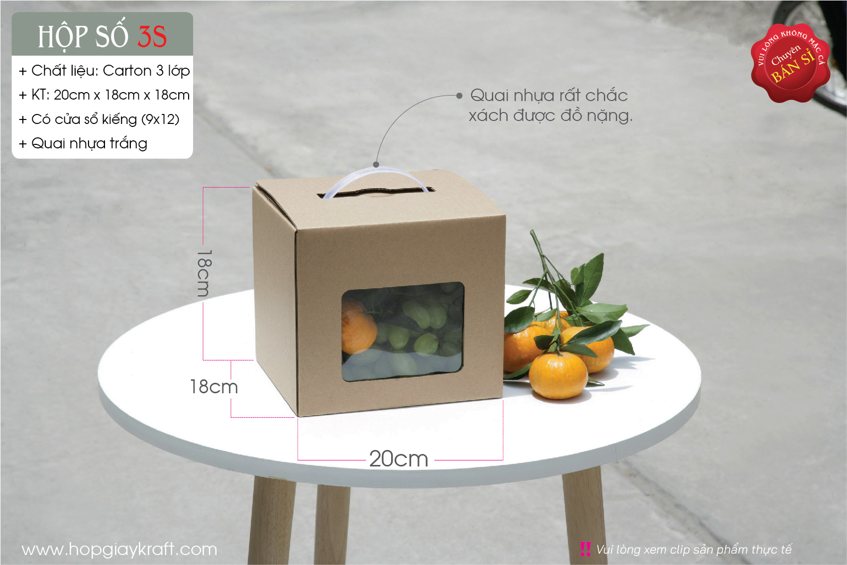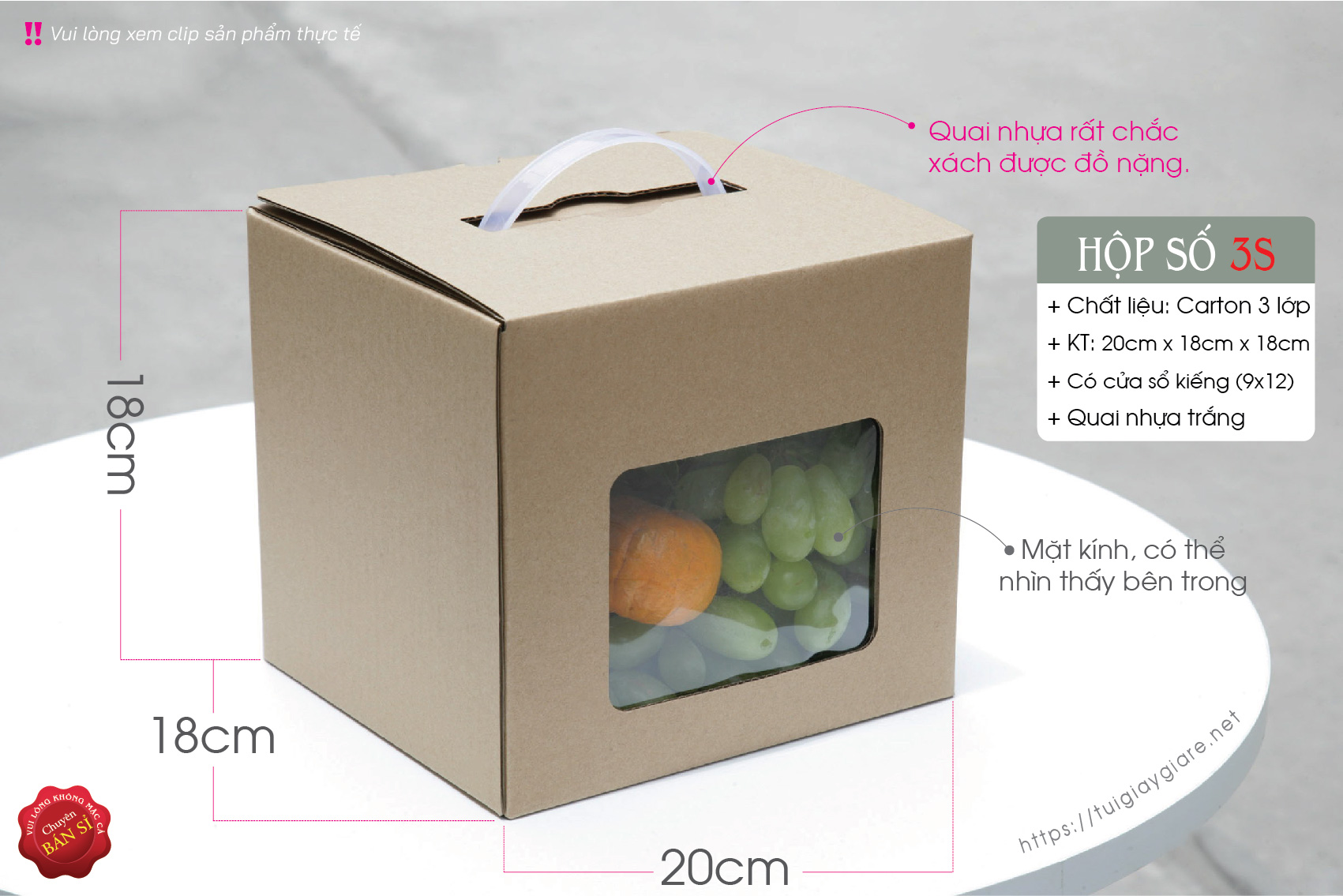 + Size S: 20cm x 18cm x 18cm (ngang x cao x hông) – Cửa sổ mica: 7.5cm x 16cm – Giá bán: 8.600 đồng/cái