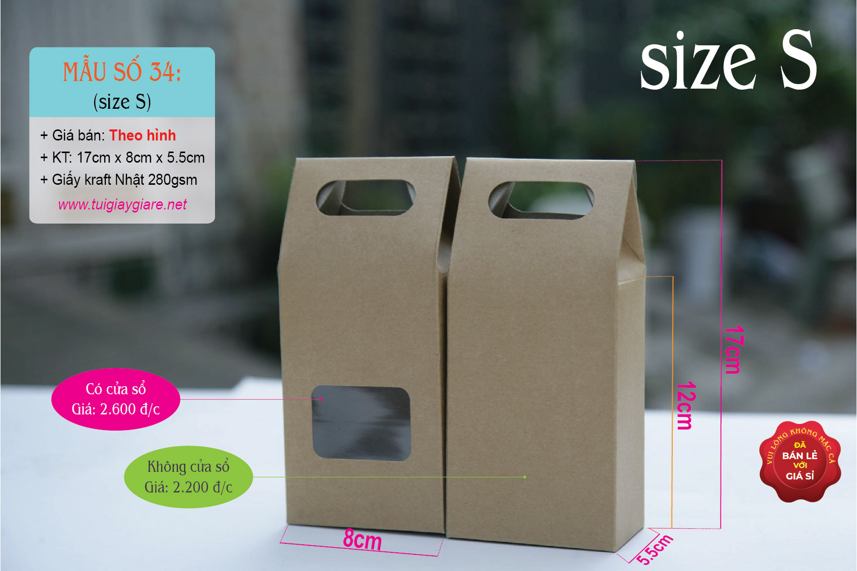 + Kích thước size S: 12cm x 8cm x 5.5cm (đây là kích thước đã trừ phần chóp, chứa hàng được) – Giá bán: 2.600 vnđ/c
