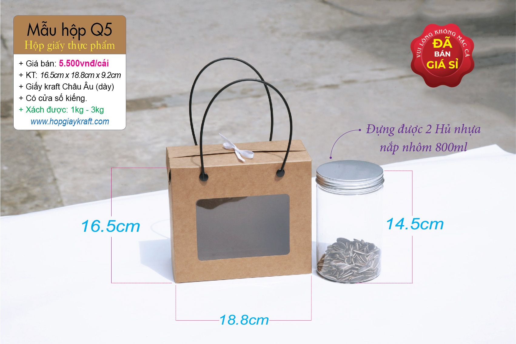 *** Dùng đựng hộp thực phẩm, khô mực, khô heo, khô gà, hạt điều, đậu phộng; Đựng được 2 hủ nhựa nắp nhôm 800ml hoặc 2 hủ nhựa vuông 1kg, sản phẩm có kích thước phù hợp. Hộp giấy thực phẩm