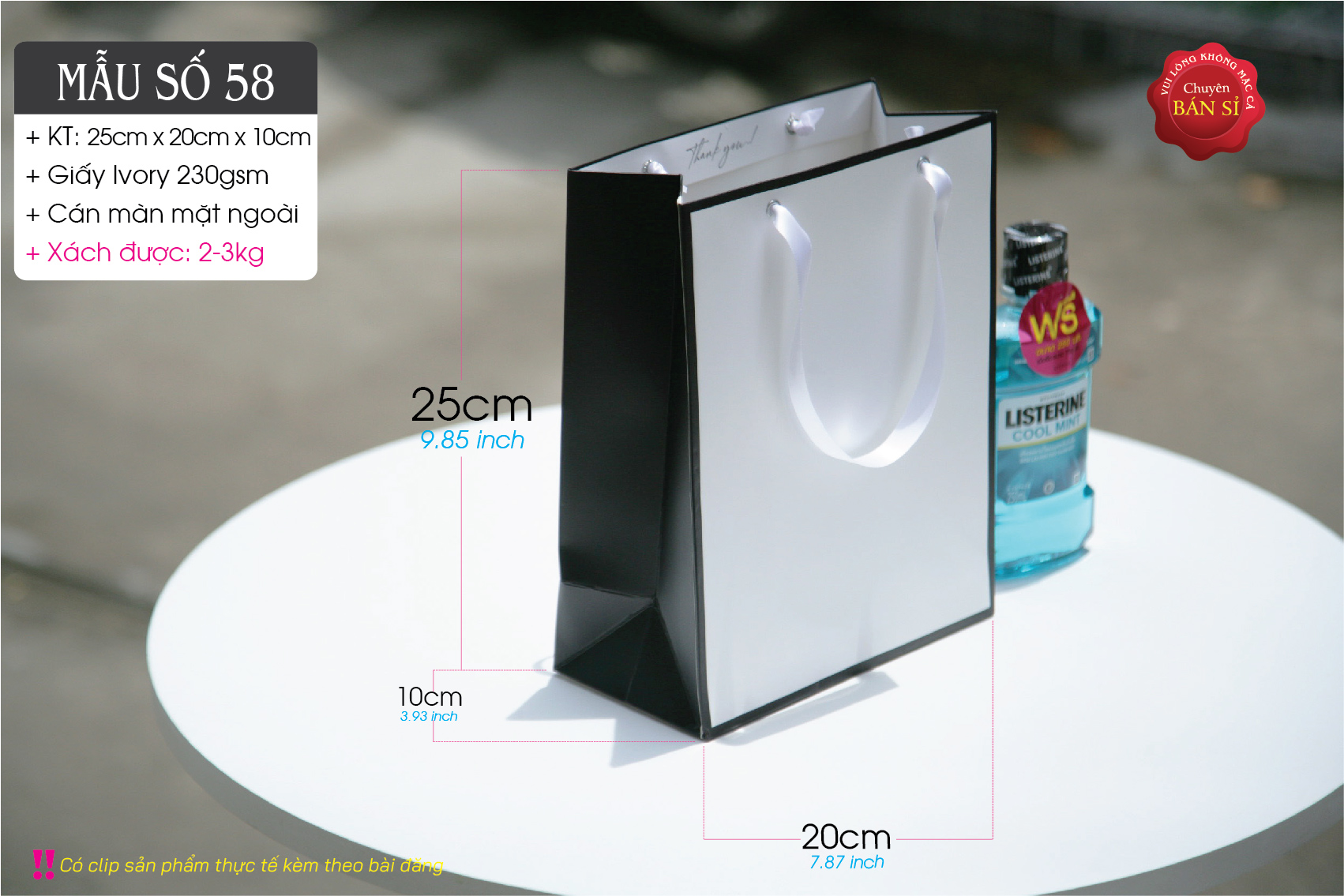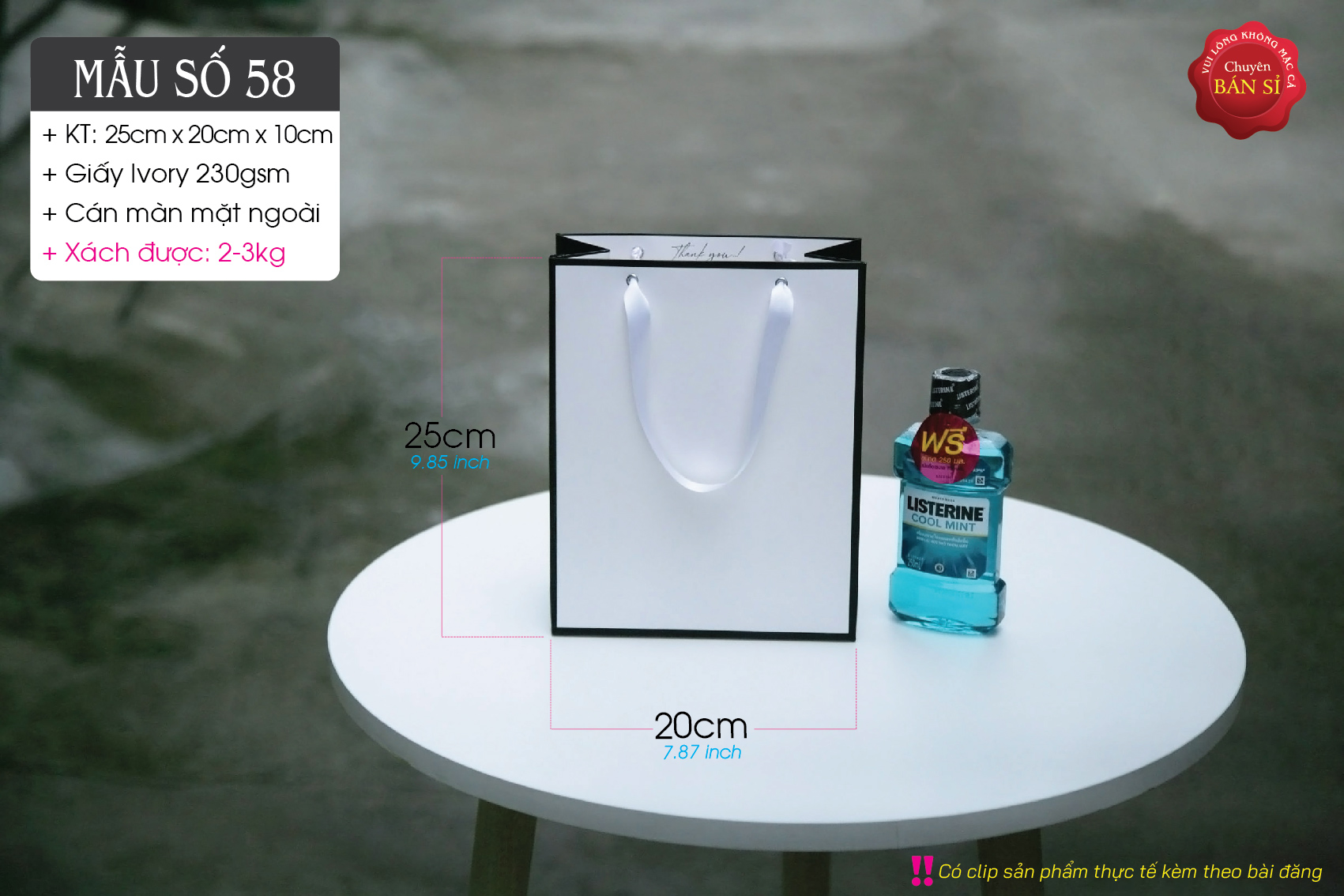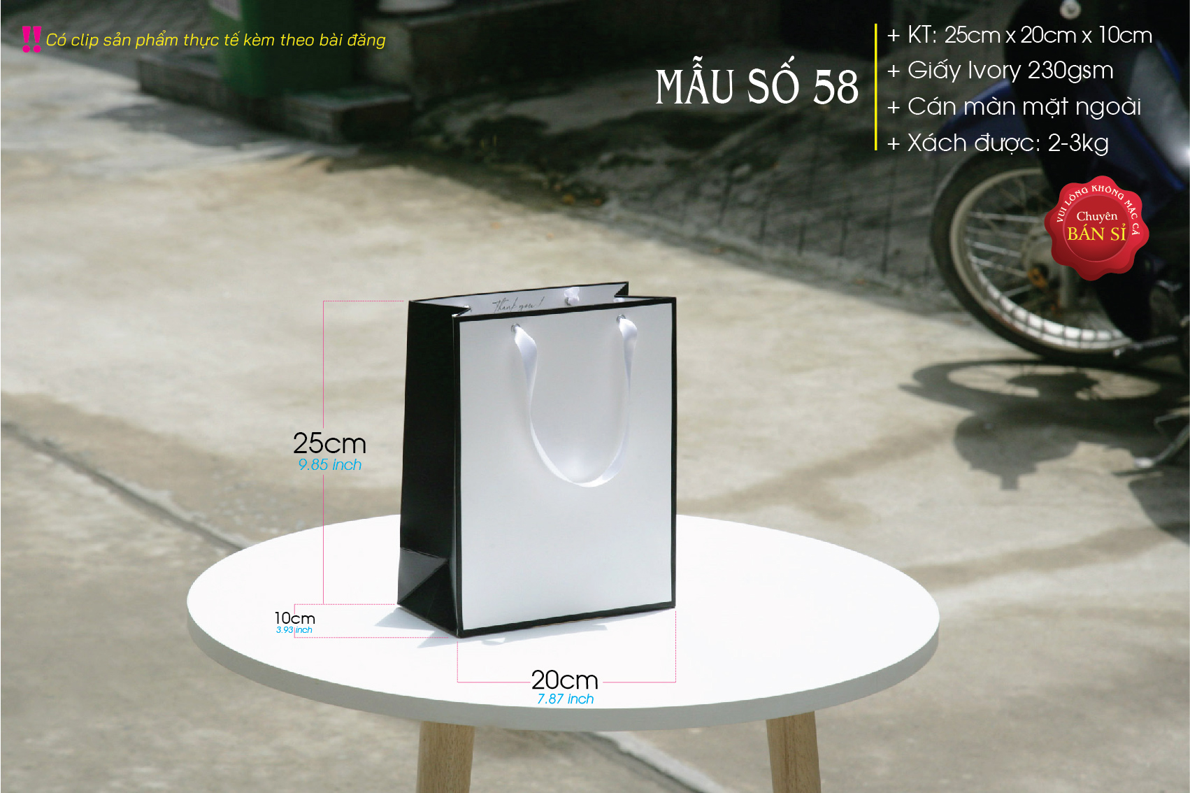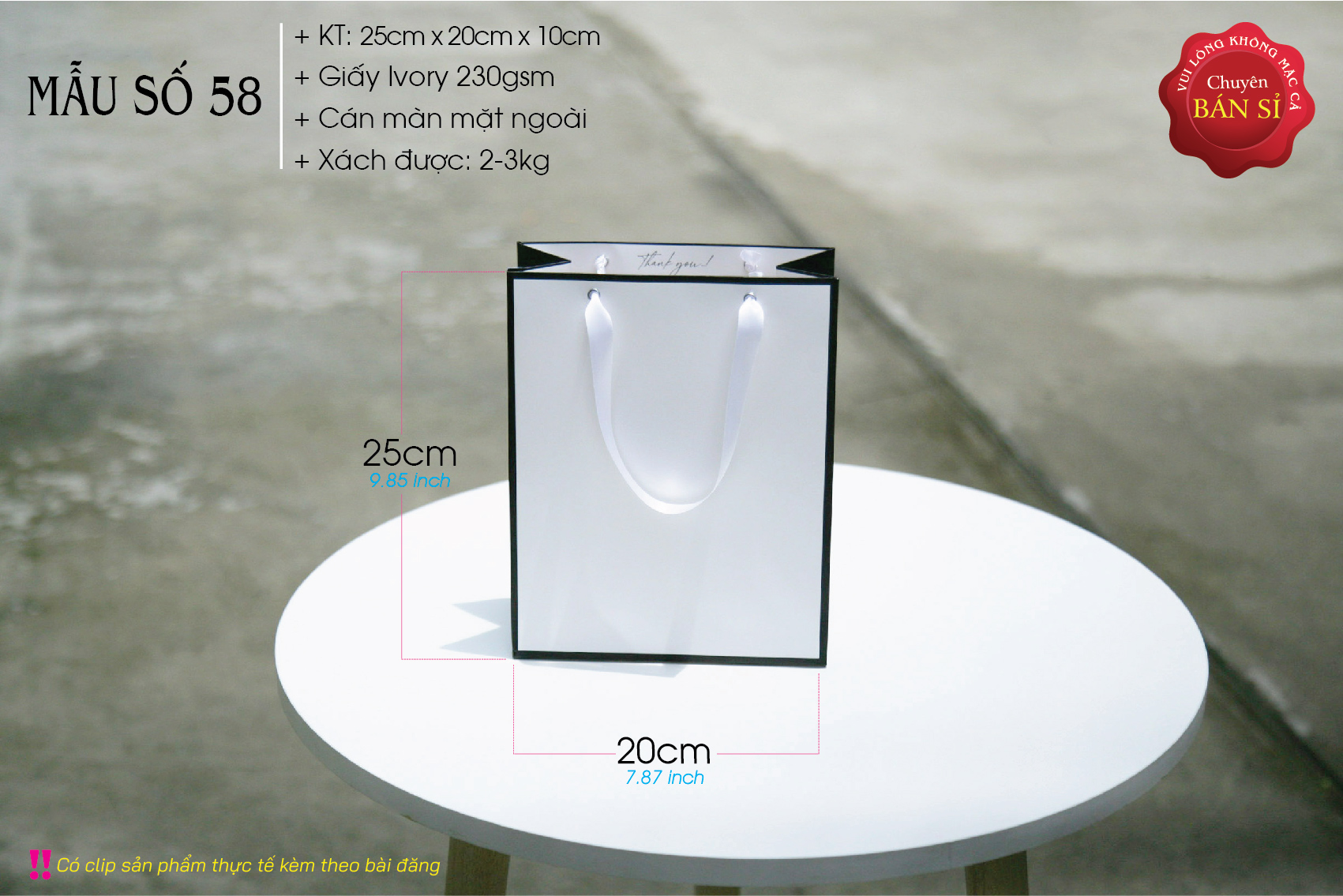 Chất liệu: Giấy Ivory 230gsm (dày và cứng cáp so với kích thước túi).