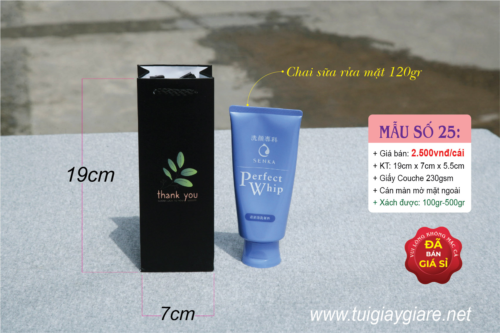 Kích thước: 19cm x 7cm x 5,5cm (cao x ngang x hông).