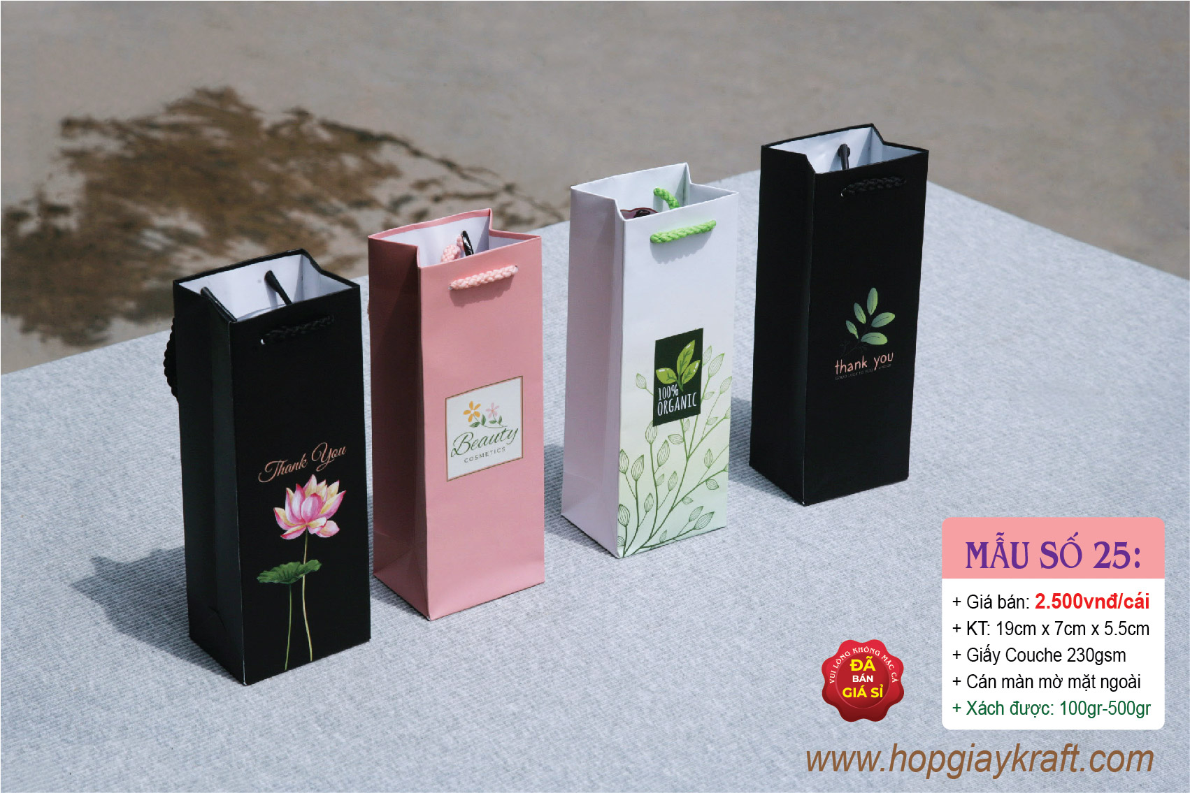 Chất liệu: Giấy Couche 230gsm (độ dày phù hợp với túi)
