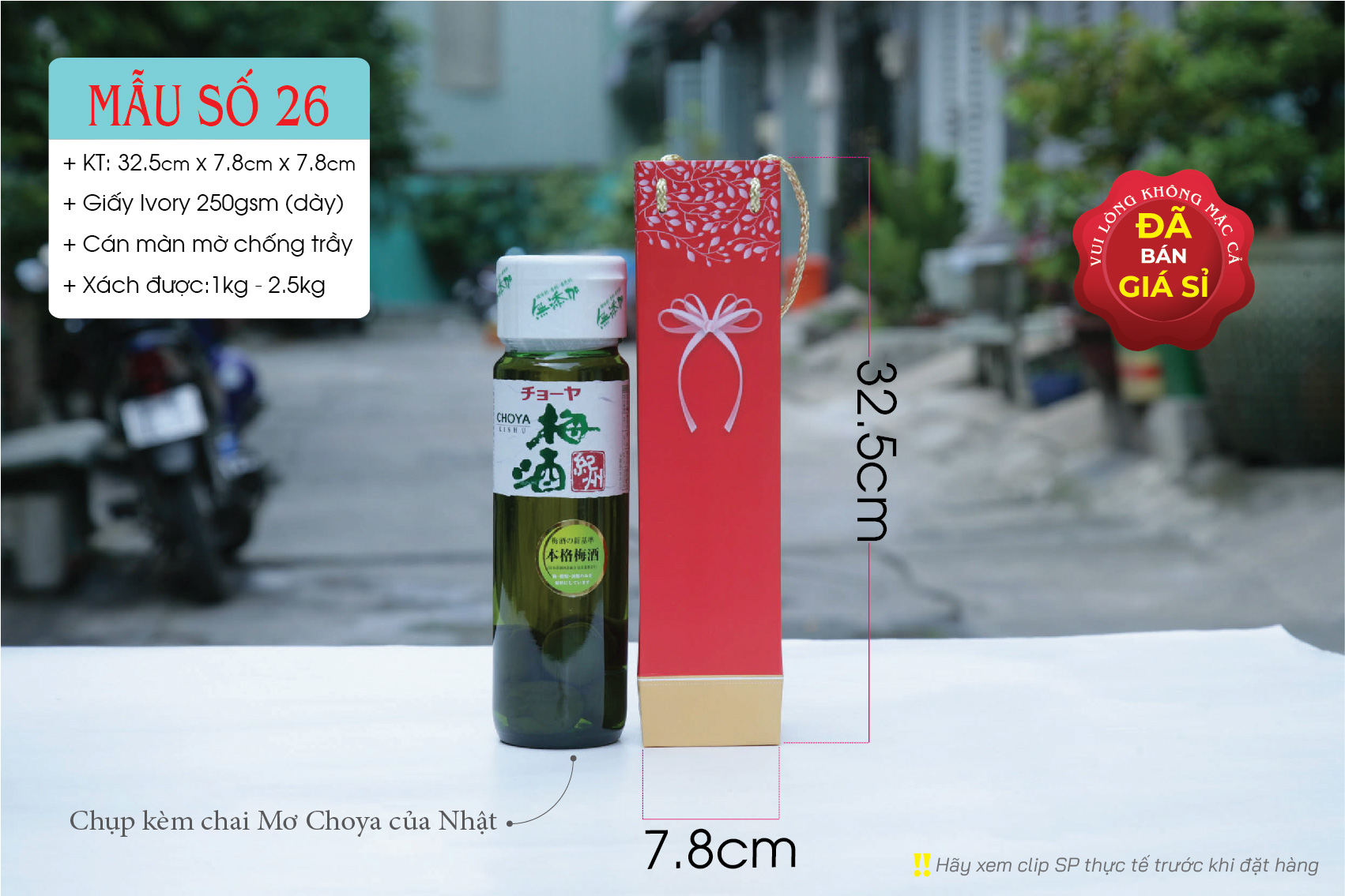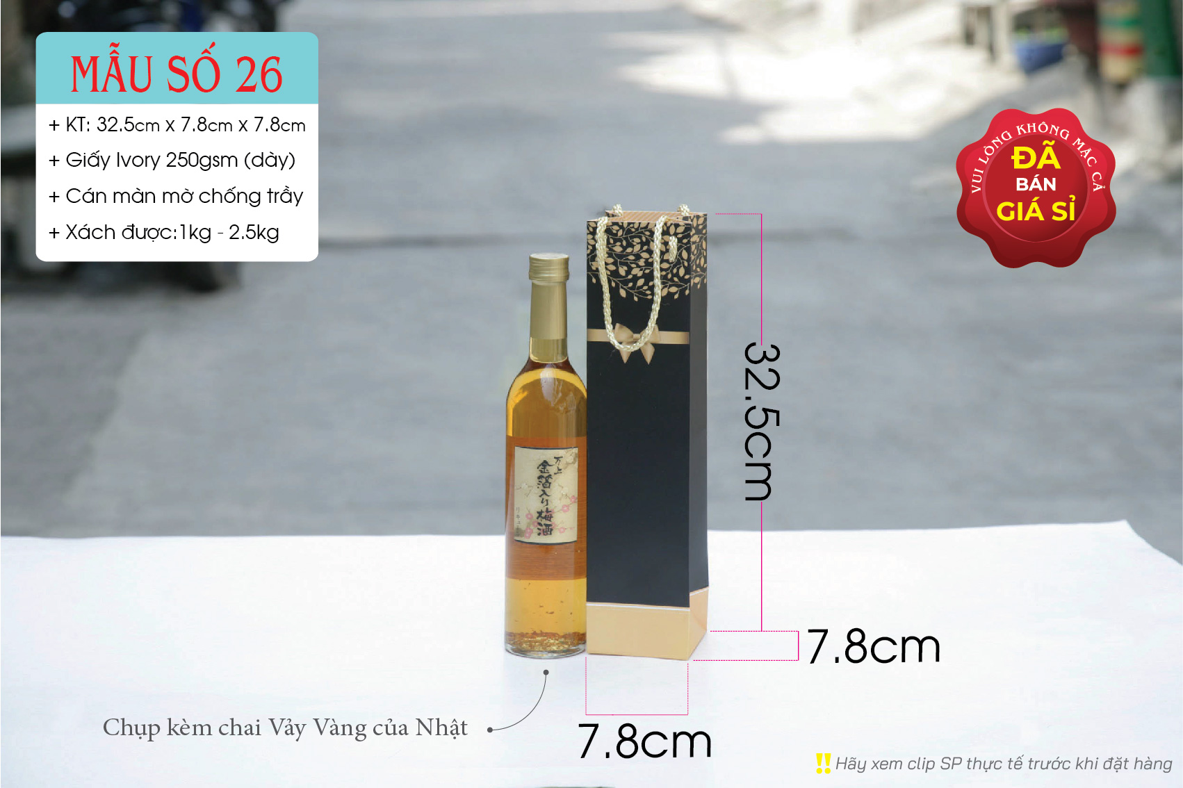 Kích thước: 32.5cm x 7.8cm x 7.8cm (chứa vừa chai rượu vang 750ml)